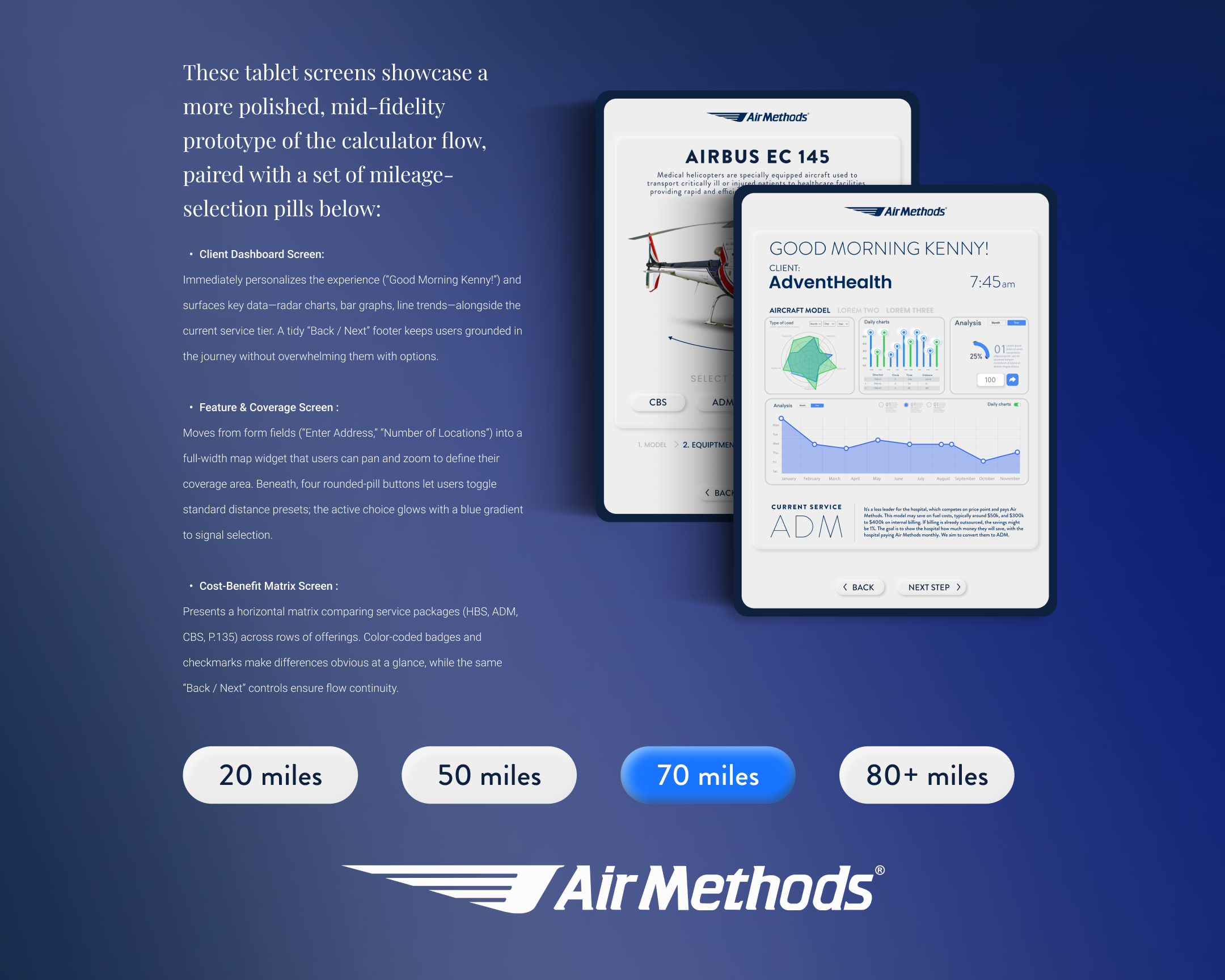 A digital display showing a prototype of a tablet with an aircraft management application. The background is dark blue, with explanatory text on the left and two tablet screens on the right. The screens show data visualizations, charts, and a message saying "Good morning Kenny!" from Air Methods for a client named AdventureHealth, with buttons labeled "Back" and "Next Step" at the bottom. The bottom of the display features four mile-distance buttons, including "70 miles" highlighted in blue and the Air Methods logo.