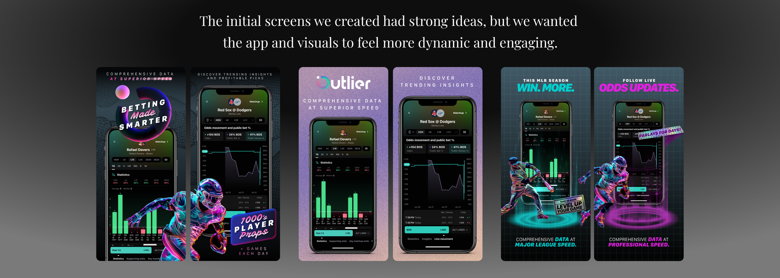 Collection of promotional images for Outlier betting app showing phone screens with sports statistics, data graphs, and betting insights, with gaming-themed graphics and neon-style design elements.
